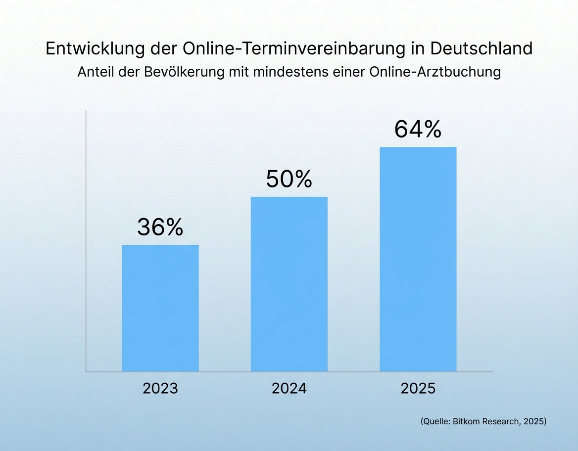 Es gibt Studien zu Arztpraxen, wie beliebt die Online-Terminbuchung bereits ist. Diese ist interessant, da alle Altersgruppen (vor allem die Ältere) Arzttermine benötigt. Im Jahr 2026 haben bereits 64% der Menschen einen Arzttermin Online vereinbart, wobei 58% die flexible Auswahl an Terminen schätzen (Quelle: Bitcom, 2025)